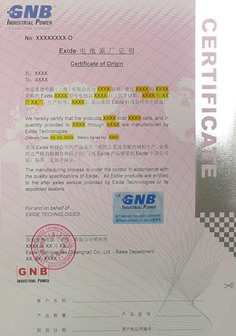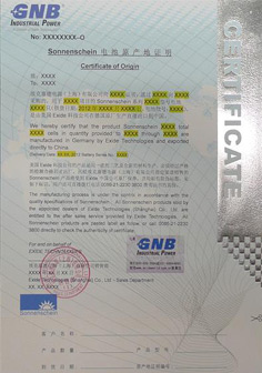 埃克塞德公司的Sonnenschein陽光及GNB系列電池為原裝進口電池,為德國、美國、西班牙及葡萄牙原廠生產后直接出口到埃克塞德中國公司。請在購買電池時向經銷商要求出具該電池的原產地證明,并檢查該證明是否有埃克塞德電源(上海)有限公司銷售部公章,樣本如下。